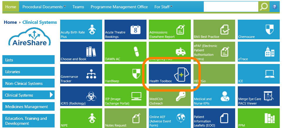 Visitors who are already authenticated on the intranet/extranet are automatically authorised to access the Trust Toolbox. A Toolbox button, link, logo, or icon is available on the intranet homepage, or on Desktop computers, which the user can simply click to access the toolbox.