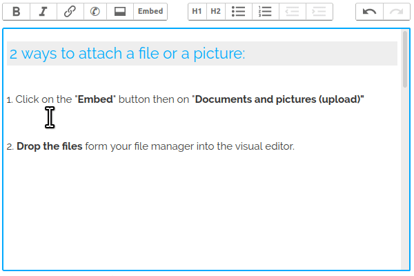 All pages have a text block where you can write your texts, links, various formats (bold, heading...), embed file attachments, pictures, and videos.