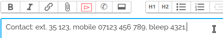 From the dropdown, select either an individual contact or a full category. It will then be inserted in the page. After saving the page, the contact entry or the category it will be nicely formatted and the numbers can be dialled on a mobile device. A contact category with many entries will have a search box to allow filtering.