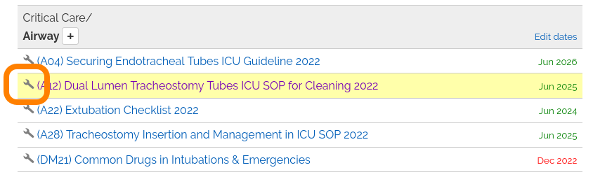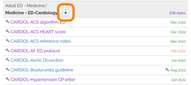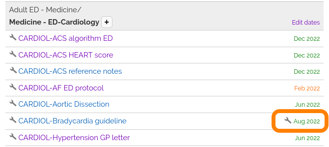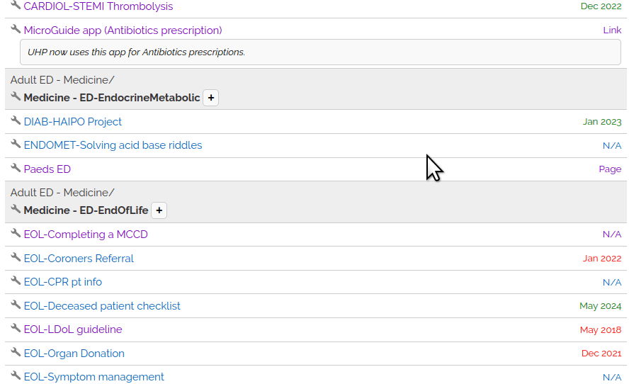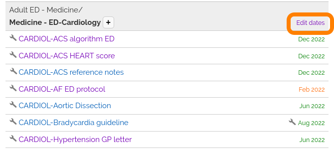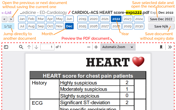 For example, a file named "ACS Heart Score-exp1222.pdf" will show the title as "ACS Heart Score" and the expiry date as "(end of) December 2022". A file is marked as expired after the end of the month, and will be shown with a red bullet or a red date, or may be hidden, in this case starting January 1st 2023.
