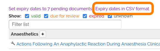 Above the listing, click on the link "Expiry dates in CSV format". The file can be imported in your spreadsheet software and will list all PDF files with their expiry date, last modification date, status and folder path. sync-csv-export.png23 KB