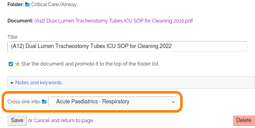 D. Press Delete to delete the entry. Note: documents in the shared folder cannot be deleted here (only the custom title, star, and notes are deleted), you need to remove the shared documents from the folder itself. This button deletes items that are external links or other attachments.