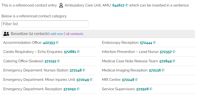 From the dropdown, select either an individual contact or a full category. It will then be inserted in the page. After saving the page, the contact entry or the category it will be nicely formatted and the numbers can be dialled on a mobile device. A contact category with many entries will have a search box to allow filtering.