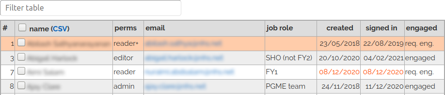 The "engaged" column shows "req. eng." (requiring engagement) for users who may need to be reminded / nudged about the toolbox or asked whether they have difficulties -- you can select them, then under the table click on the link to email them. This metric is currently defined as either one among: