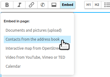 In the visual editor, click on "Embed", then on "Contacts from the address book":